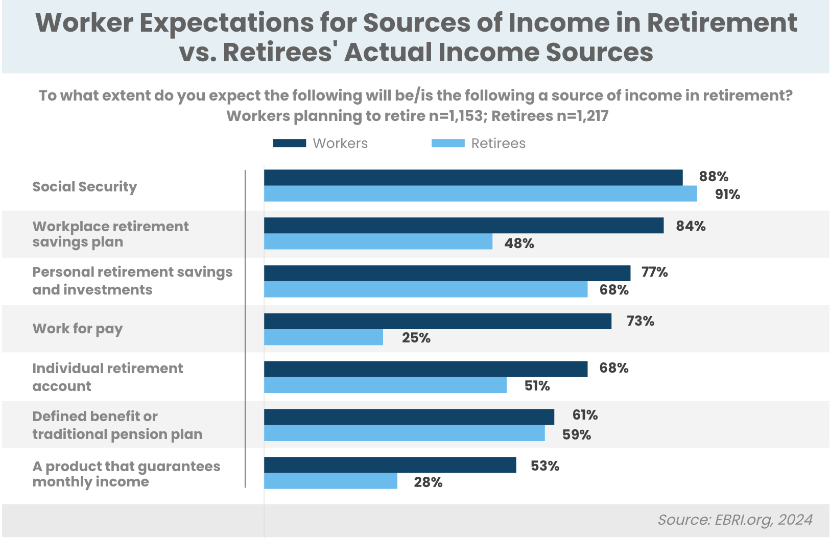 What workers anticipate in terms of retirement income sources may differ considerably from what retirees actually experience.