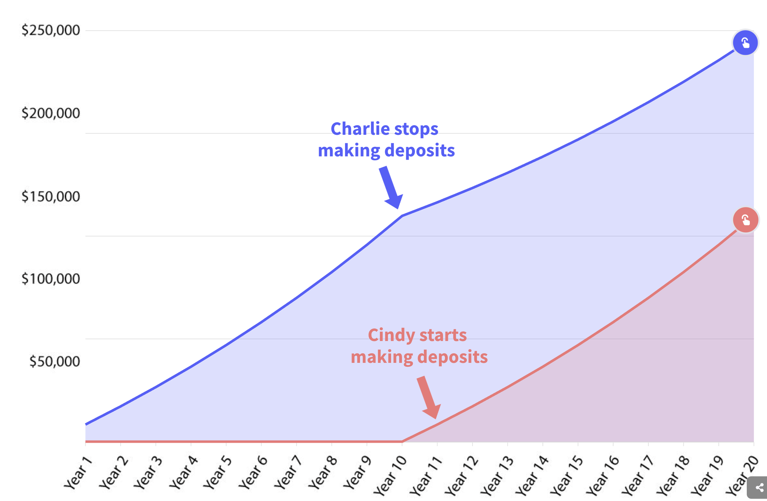 Cindy and Charlie have both invested the same $100,000. However, Charlie's balance is higher at the end of 20 years because his account has more time for the investment returns to compound.